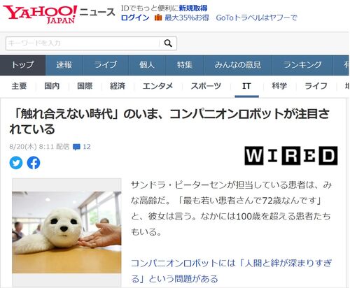 「触れ合えない時代」のいま、コンパニオンロボットが注目されている(WIRED.jp) - Yahoo!ニュース 介護ロボットのパロがコロナ禍でコンパニオンとしても本格的に注目されはじめました。これまではアジアや欧州中心に多くの販売実績を築いてきたパロ。YAHOO…